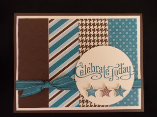 Here's a great way to use the alternate side of the Festival of Prints Designer Series Paper Stack that is featured in the Holiday Catalog. I love how Stampin' Up! creates our holiday designer paper with one side for the holiday and the other side with a non-holiday theme so your investment can be used all year long. Here are few tips to creating this card. 1) The panel to the far left is not designer paper, but a strip of cardstock that I ran through the Big Shot with the Chevron embossing folder. 2) The Merry Minis stamp set, also featured in the Holiday Catalog, has a star image that can be used all year long. 3) I used the Merry Minis punch pack to punch out the star. This punch pack includes three images; star, ornament and Christmas tree. 4) I know I've shared my ribbon tip over and over again but it's really a great shortcut. I cut two pieces of ribbon; one at 6" and another at 4". Adhere the raw ends of the 6" piece behind the vanilla layer of cardstock. Tie the 4" piece under that strip of ribbon and make a knot. This tip saves you nearly 1/2 of the ribbon you would need if you were to go all the way around the inside of the card.