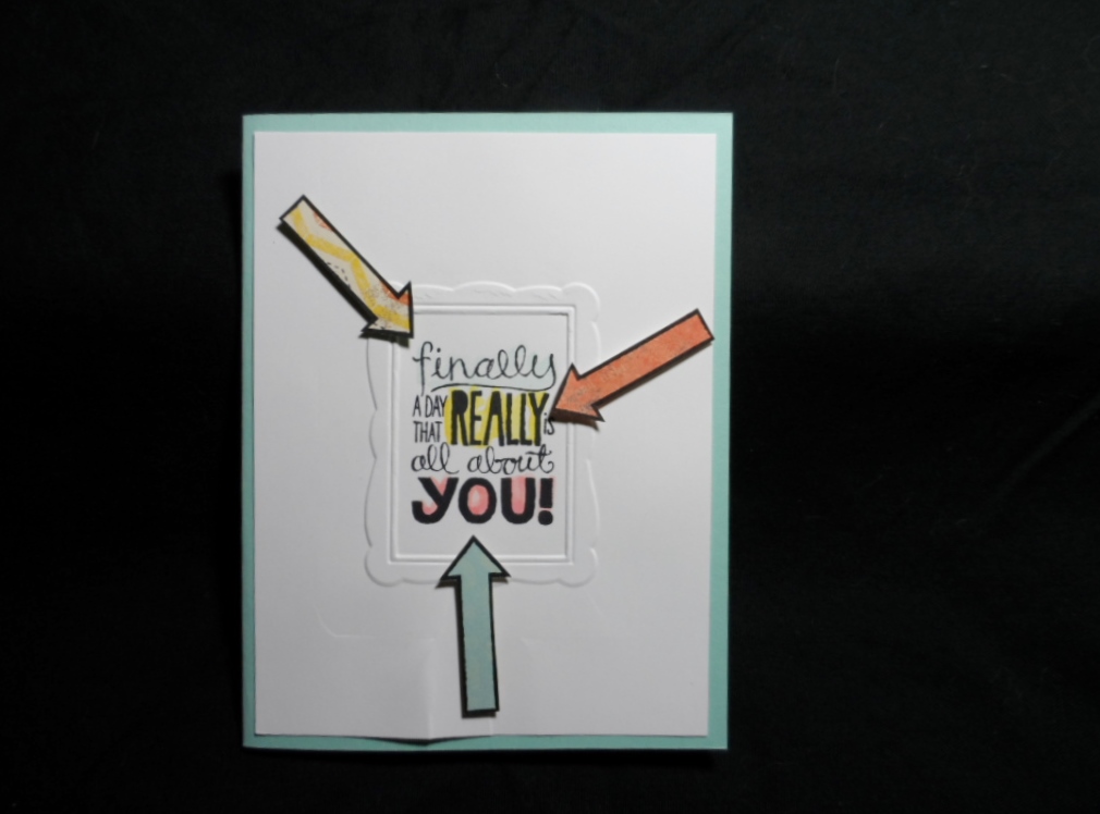I'm hoping the only thing you notice is the cute card design. I got the idea from Stampin' Connection, a demonstrator only website filled with thousands of ideas. Yep, a GREAT PERK of buying the Starter Kit and upgrading your creativity level! So, the confession...(I can't believe I'm actually going to point this out to you but here goes...) see the Pool Party arrow at the bottom? Look just to the left of it? See the wrinkle? UGH My confession is going to be a huge tip for you. When you place the embossing frame over your words and run it through the Big Shot be sure you have everything going in straight. The bottom of the folder can create a crease if you aren't careful. I was going to redo the card but then I thought "heck, Lisa, you aren't perfect...show them how imperfect you REALLY ARE!" So, there you have it. In hindsight I should have put that arrow OVER the crease to hide it. I'm headed to my stamp room to rip the arrow off and move it! Self forgiveness is a good thing. Supplies:
